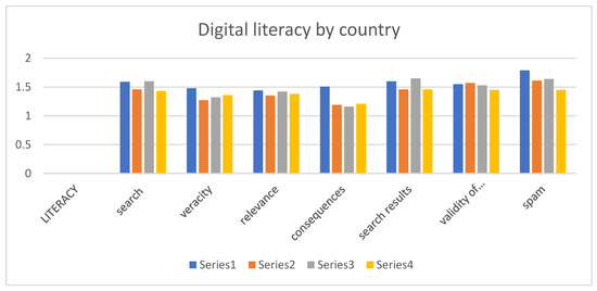 In terms of literacy, the following graph shows the differences between countries, which are mainly to be found in skills such as checking the veracity of information, analyzing the relevance of information, the consequences of publishing certain content and detecting spam emails (Figure 4).