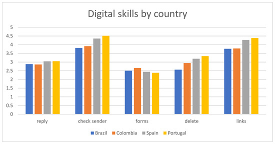 Finally, in terms of digital skills, statistically significant differences can be seen in practically all the dependent variables and between countries (p < 0.001), except for checking and verifying the email address, where the difference between Brazil and Colombia (MBRA vs. MCOL = 0.018) shows that within the same Latin American context, these differences tend to be lower. Additionally, in terms of checking the web address or website, differences exist between Colombia and Spain, and between Colombia and Portugal, which highlights the fact of the influence of the context, since in this case, the discrepancy between a Latin American country and two Hispanic countries is demonstrated (Figure 5).
