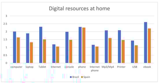 When we compare the differences between Spain and Brazil, statistically significant differences can be seen in all the dependent variables and between both countries (p < 0.001) when we focus on the digital devices available in the home, including: computer, laptop, tablet, Internet connection, video games, smartphone, e-book and USB memory sticks. This situation is similar to the digital devices available at school.