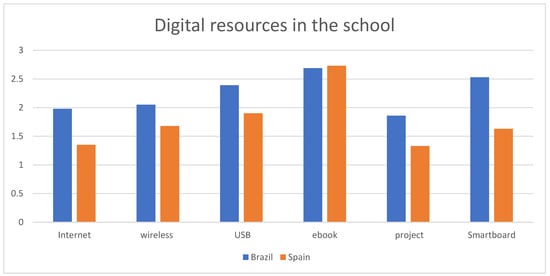 On the other hand, in terms of resources available at school, Brazil is also the country with the highest average scores, except in the case of the availability of books at school, where Spain has the highest average (Figure 7).