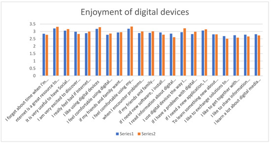 In terms of enjoyment, we find some statements with higher average scores in Spain than in Brazil, such as considering the Internet as a great resource, liking the use of digital devices and using them as desired or choosing applications. However, the opposite is true for other statements, such as forgetting about time when online, learning about digital devices, playing online games or sharing information about digital devices with friends (Figure 8).