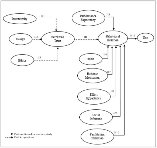 Perceived trust refers to users’ perceptions about the expected reliability and integrity of the chatbot platform. According to previous studies [34,35], perceived trust and behavioural intention have a direct relationship, whereby trust in using or adopting technology will lead to individual dedication to participating in specific activities. Previous research has offered some hints as to the crucial elements in figuring out whether or not users trust chatbots. However, given that chatbots include a number of extremely unique qualities, it is necessary to specifically examine trust in relation to this interactive technology.