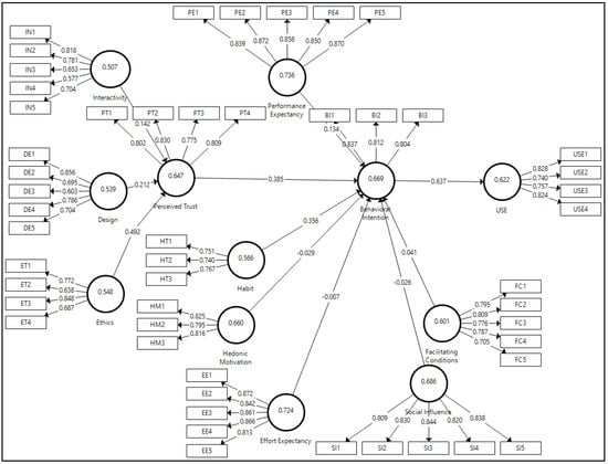 Through assessing internal consistency reliability, convergent validity, and discriminant validity, the measurement model was created to examine the validity and reliability of the constructs and indicators [44,45,46]. To assess the internal consistency reliability of the constructs, Cronbach’s alpha (CA) and composite reliability (CR) were used. Table 2 shows that the CA values were between 0.72 and 0.912, whereas the CR values were between 0.827 and 0.933. As for the habit construct, the CA value reported was 0.6178, which is still acceptable. According to [44,45,51], both CA and CR values exceeded the benchmark level of 0.70, thus demonstrating the measures’ high dependability. The outer loadings of the indicators were used to examine the convergent validity and to extract the average variance (AVE). As shown in Table 2, the study’s convergent validity was achieved because the factor loadings were >0.708 and the AVE values were >0.50. [45]. The degree of construct separation is explained by the discriminant validity. In this paper, the heterotrait–monotrait (HTMT) ratio was used to evaluate the discriminant validity [52]. The HTMT criterion was satisfied, as indicated in Table 3, since all values were below the 0.85 ceiling value. Figure 2 shows the structural model based on the PLS-SEM.