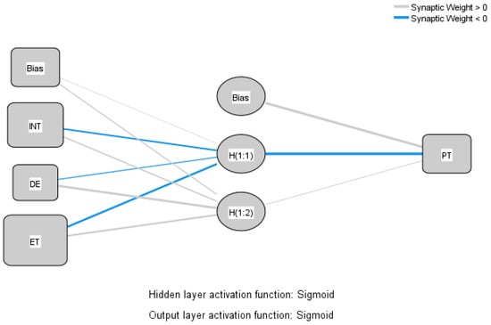 For improved model performance, the range of the input and output neurons was kept within [0, 1] [43]. Overfitting was avoided by using a tenfold cross-validation technique in the ANN models, in which the training phase used 90% of the data and the testing phase used the remaining 10% [41,43]. Three endogenous constructs, namely, behavioural intention, perceived trust, and use, were included in the research model created for this study. Consequently, as shown in Figure 3, Figure 4 and Figure 5, the research model was divided into three ANN models. The first ANN model comprised three input layers (as shown in Figure 3), i.e., interactivity, design, and ethics, with one output layer, i.e., perceived trust. As shown in Figure 4, the second ANN model had two input layers, i.e., habit and perceived trust, and one output layer, i.e., behavioural intention. The third ANN model contained one input layer (behavioural intention) as shown in Figure 5 and one output layer (use).
