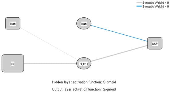 The first stage of this study applied PLS-SEM to test the correlations and determine the factors influencing students’ chatbot adoption in the HEI context. The ANN analysis approach was used in the second stage to rank the factors affecting chatbot adoption. This study chose the ANN because, as previously reported [4,43,47], it outperforms more conventional statistical tools such as multiple linear regression, binary logistics regression, and SEM in detecting both linear and nonlinear relationships. An input layer, one or more hidden layers, and an output layer are typical neural network components. The sigmoid function was used as the activation function for the output and hidden neurons. The sigmoid function was used as the activation function for the output and hidden neurons.