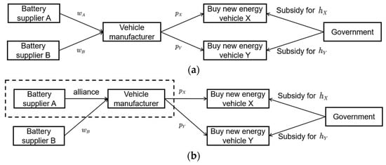 To slow down the negative impact of the “fall off” subsidy policies on new energy vehicle enterprises, it is necessary for them to find a new way to be competitive. As is known to all, the core technology of new energy vehicles is battery technology [9]. Furthermore, the amount of the government subsidy is related to the mileage of the new energy vehicle purchased by the consumer [10]. The greater the mileage, the greater the subsidy amount. The mileage depends precisely on the performance of the battery. But most vehicle manufacturers are unable to produce batteries and rely heavily on battery suppliers. As for batteries, there are two ways for new energy vehicle manufacturers to obtain them: buy batteries from battery suppliers and produce new energy vehicles independently, or cooperate with battery suppliers to jointly produce new energy vehicles based on a cost-sharing and revenue-sharing contract model [11]. Therefore, against the background of decreasing subsidies, the key to how new energy vehicle manufacturers can break through the bottleneck and gain a competitive advantage lies in batteries. The methods of cooperation between car suppliers and battery suppliers are also gradually becoming an issue worthy of study.