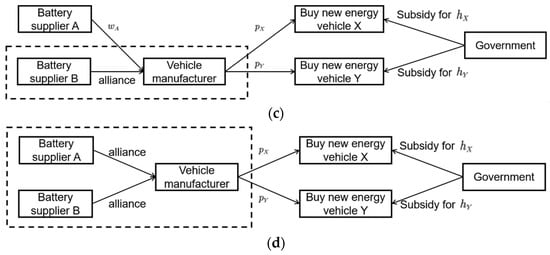Four cooperation models between vehicle manufacturers and battery suppliers. (a) Model N; (b) Model MA; (c) Model MB; (d) Model MAB.