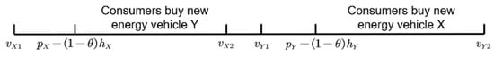 When consumers buy new energy vehicle X/Y, they must meet condition or . When consumers’ perceived value satisfies or , they will buy the vehicle. Their purchase behavior is shown in Figure 2. Hence, according to the proportion of consumer valuation, the demand for new energy vehicle X/Y is: