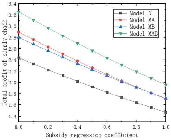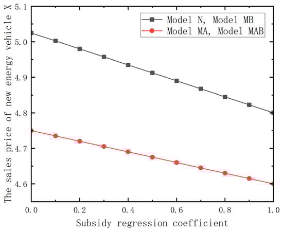 Next, combined with a numerical example, this paper studies the influence of subsidy reduction coefficient () on the pricing of new energy vehicles, the market demand for new energy vehicles and the total profit of supply chain under different cooperation models (model N, model MA, model MB, model MAB).