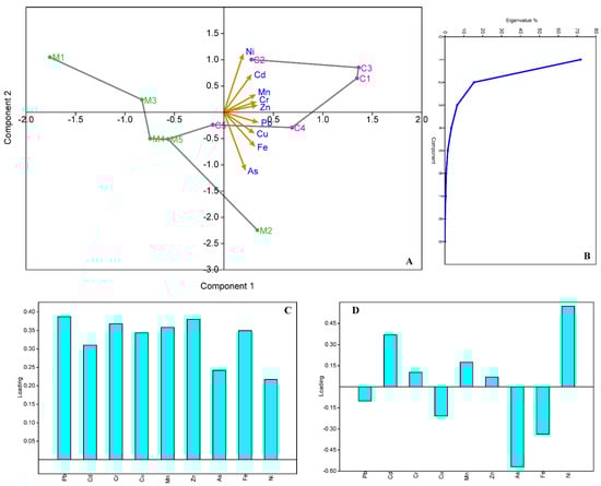 Figure 3. PCA loadings and scatter plot of heavy metals obtained from the Chattogram and Mongla port sediments. (C1–C5 = sampling sites in Chattogram Port, M1–M5 = sampling sites in Mongla Port, (A) = PCA scatter plot, (B) = eigenvalue plot, (C) = loadings of PC1, (D) = loadings of PC2).