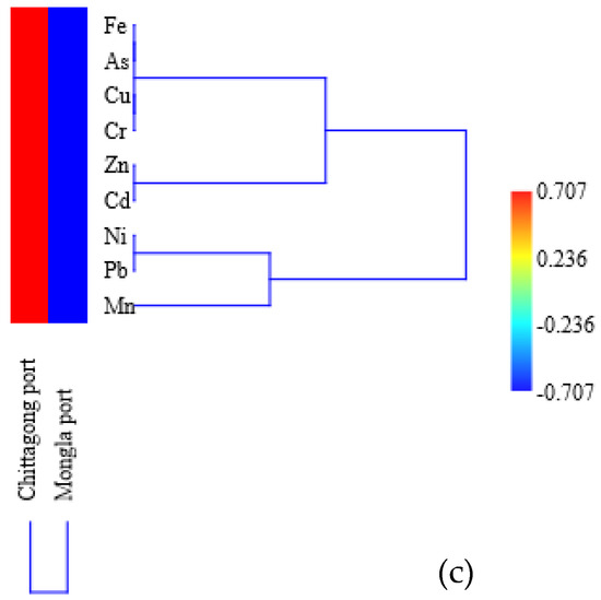 Figure 4. (a) Classical cluster analysis between the sampling stations of Chittagong Port, based on measured-metal contamination. (b) Cluster analysis between the sampling points of Mongla Port. (c) A comparative analysis by classical analysis between the two seaports.
