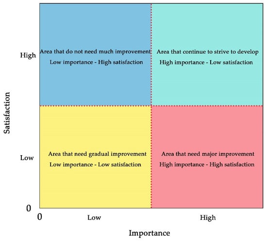 As a diagnostic model biased toward qualitative research, importance–performance analysis (IPA) can provide managers with corresponding strategies and recommendations for the sustainable development of the landscape. IPA was first proposed by Martilla and James to analyze product attributes [36]. Due to its simplicity, intuition, and ease of interpretation, IPA has been frequently introduced into the field of landscape architecture in recent years. Many scholars have used the IPA method to evaluate the importance of and satisfaction with each indicator of green space, so as to study the recreation demand of park visitors and the supply–demand relationship of the cultural ecosystem. Yu et al. [37] constructed an IPA model to reflect visitors’ basic attitudes, entertainment sense, and satisfaction evaluation, as well as their preferences regarding the future development of community parks. Fan et al. [38] coded and rated the recreational factors of Fuzhou West Lake Park by the IPA method. Wang et al. [39] analyzed the supply and demand characteristics of cultural ecosystem services in the waterfront space through the IPA model and proposed strategies to optimize the supply of related services.