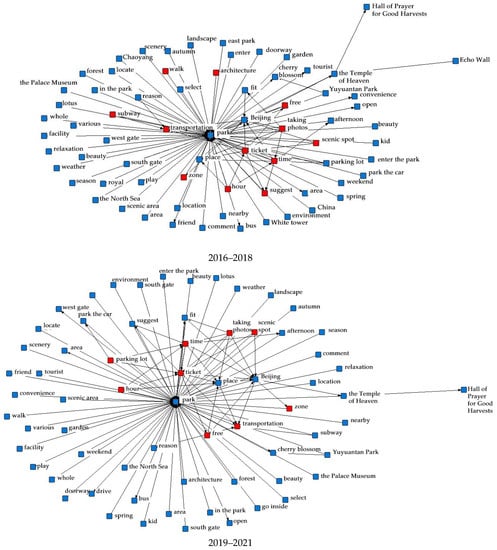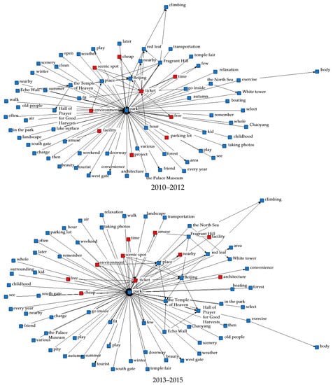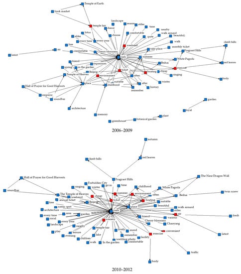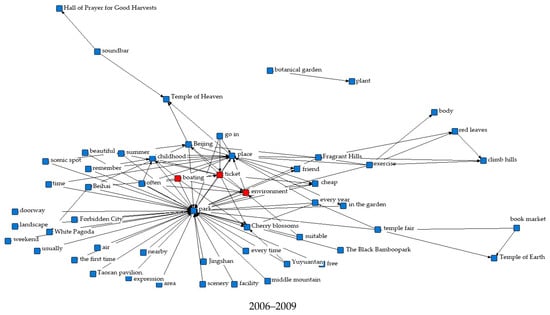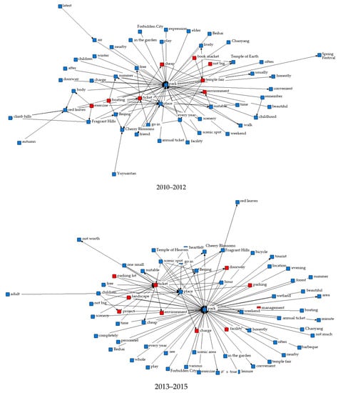 People’s happiness with the parks progressively grew between 2006 and 2021. As a result, Beijing’s parks total network score improved every year, with the average score rising steadily from 4.0 to 4.6 stars. Meanwhile, due to the widespread popularity of social networking platforms and the government’s emphasis on park construction and maintenance in the face of urban renewal in the past two years, more and more people have been using Dianping to record their personal visit experiences, resulting in a significant increase in the number of park reviews in 2019–2021, and these will continue to increase. According to the cycle theory of urban renewal and urban investment market, we selected online review texts from 2006 to 2009, from 2010 to 2012, from 2013 to 2015, from 2016 to 2018, and from 2019 to 2021 for semantic network analysis, and since the number of reviews in 2006 was too low, they were merged directly into the first cycle so we could explore in depth the elements that people are concerned about related to urban parks that have changed over time.