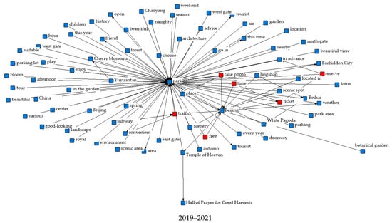 To understand the elements that influence citizens’ ratings of parks and the changes in these elements over time, we generated positive semantic network illustrations (Figure 2) and negative semantic network illustrations (Figure 3). To understand the factors that affect citizens’ ratings of parks and the changes in these factors in each period, we extracted the evaluation texts with a rating of 5 stars in each period to perform high-frequency-word and semantic network analysis and developed a positive semantic network diagram (Figure 3). To create a negative semantic network map, the assessment texts from each period with a rating of 3 stars or less were retrieved (Figure 4). The statistical results show that, in the positive semantic evaluation, citizens focused all the time on two elements: ticket and environment. From 2016 to 2021, two new elements of focus were added: attitude and photography. However, in the negative semantic assessment, across all time periods, “free” and “children” were the aspects that visitors continued to focus on, while “parking lot” was a newly added element of concern from 2013 to 2021. Appropriate price and quantity of tickets, beautiful and pleasant environment, sufficient play space for children, and fully functional parking lot were clearly the elements essential for enhancing the public’s evaluation of the park.