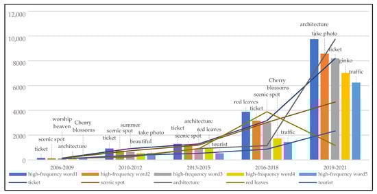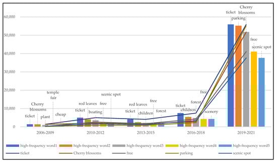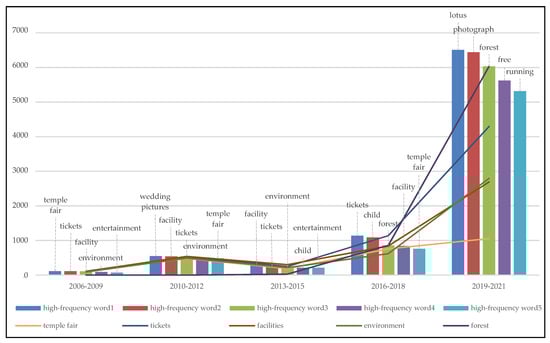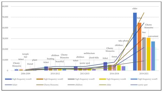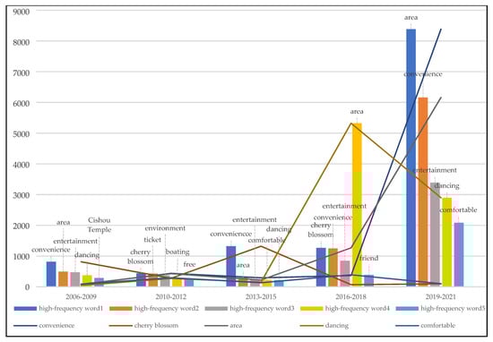 Statistical results (Figure 14) show that from 2006 to 2009, “environment,” “cheap,” and “air” were the factors most frequently highlighted by visitors when rating parks and “boating,” “exercise,” and “mountain climbing” were the main activities of people. From 2010 to 2012, the elements most in focus among people were “environment,” “attractions,” “facilities,” and “projects.” From 2013 to 2015, people generally focused on “environment,” “free,” “cheap,” and “building,” while “traffic,” “parking lot,” and so on also gradually received attention. From 2016 to 2018, “traffic,” “time,” “photograph,” “parking lot,” and other factors occupied people’s attention. From 2019 to 2021, the factors people focused on were more diversified. “Time,” “taking photos,” and “traffic” became the key elements of evaluation, while “attitude,” “management,” and “advice” also gradually emerged. “Environment,” “ticket,” and “free and charged” were always essential variables by which people assessed parks in these five periods. In addition, people paid increasing attention to convenience of transportation, scenic features, project facilities, management services, and other elements of the park. Simultaneously, the activities in the park gradually changed from boating and temple fairs to walking and taking photos, which represents not only the change in people’s entertainment interests but also the function of urban parks, from organizing specific cultural activities to providing daily leisure services.