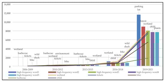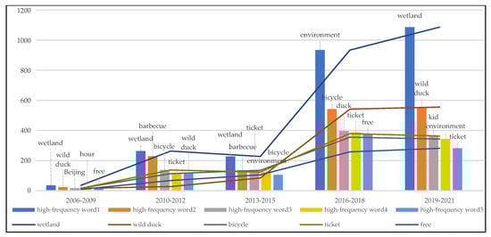In the evaluations of wetland parks (Figure 12), the focus of people was mainly on “wetland,” “wild duck,” and “bicycle,” showing that the main attraction of wetland parks was the wetland landscape, wildlife, and cycling activities. The words “parking lot” and “hour” that were connected to the trip also received a lot of interest, indicating that some visitors opted to drive to far wetland areas. The attention to “wild duck” continued to rise every year, while the word “barbecue” gradually declined, indicating that the environmental management of the park had been strengthened and visitors’ ecological experience had been enhanced in recent years.