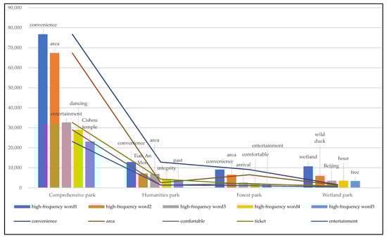 An analysis of high-frequency words (Figure 13) shows that words such as “convenience”, “area”, “comfortable”, and “ticket” were used the maximum to describe the four types of parks, demonstrating that visitors’ assessments of various parks were based on the parks’ accessibility, sufficient activity space, sensory experience, and cost of tourism. People visited comprehensive parks for daily activities, while they visited humanities, forest, and wetland parks for other important purposes. For instance, visitors tended to take part in cultural activities in humanities parks, while they were increasingly inclined to drive with their families on weekends and holidays to forest parks and wetland parks. The functions of these four types of parks varied in terms of the target activities of the crowd.