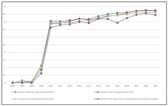 To study the differences in the evaluation of parks in different zones, we divided the 50 parks into four categories: parks within the range of all green belts (18), parks in the first green isolation belt (8), parks in the second green isolation belt (15), and parks in the ring of forest wetland parks surrounding the capital (9), according to the relevant national policies. There is no significant difference in the quality of the urban parks in the four types of areas, but in terms of the composition of park categories, it can be seen from Table 1 that the parks within the range of all green belts and in the first green isolation belt are mainly comprehensive parks and humanistic parks, while the parks in the second green isolation belt and the ring of forest wetland parks surrounding the capital are mainly forest parks and wetland parks. The average score (number of stars) of the parks in each of the four regions was calculated separately for each year (Figure 15). According to the analysis, the overall average rating of all green belts, the parks in the first green isolation belt, the parks in the second green isolation belt, and the parks in the ring of forest wetland parks surrounding the capital in each period from 2006 to 2021 was 4.53 stars, 4.58 stars, 4.52 stars, and 4.43 stars, respectively. Note that the overall evaluation of the parks showed a sharp upward trend from 2008 to 2010, while in 2010, the ratings were basically stable, at 4 stars, and then, the rating steadily increased. The rating ranged from 4.45 stars to 4.75 stars in 2021. The reason for this phenomenon may be that the scoring function of the software platform was not yet popular in the early years, and the amount of scoring data was small.