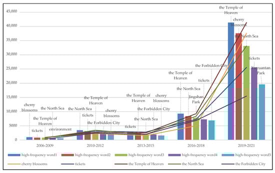 The change chart of high-frequency words analysis of text data (Figure 16) showed that people paid more attention to keywords such as “environment” and “ticket” when evaluating parks within the range of all green belts, showing that visitors attached importance to the overall environment and service convenience of the park. The use of the words “Yuyuantan” and “cherry blossoms” has been increasing in recent years, indicating that the concentrated plant landscape in a certain period was a significant attraction to visitors. The frequent usage of the terms “Temple of Heaven,” “Beihai,” “The Forbidden City,” and “Jingshan” shows that travelers continued to pay attention to and placed value on these well-known picturesque locations.