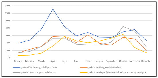 From the perspective of different dimensions of time and space, people were more inclined to go to parks within the range of all green belts in the spring and to the parks in the second green isolation belt and the ring of forest wetland parks surrounding the capital in fall. The parks in the first green isolation belt had less fluctuation in visitor numbers throughout the year. Thus, when optimizing and upgrading urban parks in Beijing, we must fully consider the strong attraction of the seasonal characteristics of plants in spring and autumn for visitors and actively construct characteristic plant landscapes and seasonal landscapes in parks to achieve the efficient use of parks, to promote urban renewal, and to enhance people’s sense of happiness.