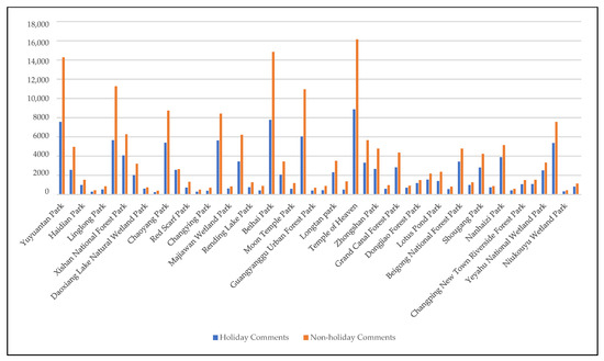 Social media text analysis has been mostly used in diverse research on recreational experience. A large amount of the latest online evaluation data has helped to identify people’s true feelings about the destination and helped managers to clearly plan strategies and tactics from various perspectives. Through text analysis, Lin et al. [31] proposed improvement strategies for Haizhu National Wetland Park in terms of infrastructure, management services, scenic spot publicity, and ecological environmental protection. Wan et al. [32] investigated users’ preferences and values related to urban parks by analyzing social media data and obtained important information for formulating social marketing strategies. Jin et al. [33] used social media data and emotion analysis to quantify and compare the positive emotions of visitors to different types urban parks and proposed suggestions for park planning and management. Tenkanen et al. [34] used data from Instagram, Twitter, and Flickr to systematically assess the popularity of and number of visitors to several national parks in 2014. Sinclair et al. [35] used the Flickr website to predict visitor sources and recreation patterns in German national parks.