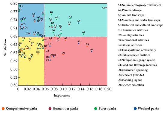 The IPA matrix took the visitor expectation (importance) as the horizontal axis, the visitor satisfaction as the vertical axis, and the overall average value as the separation point of the X–Y axis and formed an evaluation model that included areas that continue to strive to develop, areas that do not need much improvement, areas that need gradual slow improvement, and areas that need major improvement (Figure 2), which can provide guidance for the landscape planning and construction of parks.