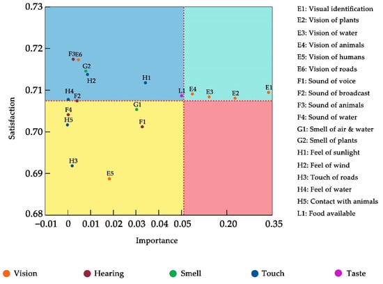 According to the IPA (Table 6, Figure 24) for different sensory perception, people’s demand for vision perception was significantly higher than that for other sensory perception, accounting for 81.91%; the demand for taste, touch, and hearing perception accounted for 5.32%, 4.70%, and 4.18%, respectively; and the demand for smell perception was relatively small, accounting for 3.89%.