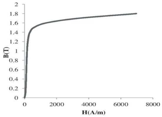 Since the saturation state of the ferromagnetic material used in the motor design is examined, the B-H curve for the M19_24G material is given in Figure 3. A linear increase extends up to approximately 1.6 Tesla, as seen in the M19_24G curve. After 1.6 Tesla, the curve begins to bend. It is observed that it passes into the saturation region, at a value of approximately 1.8 Tesla.