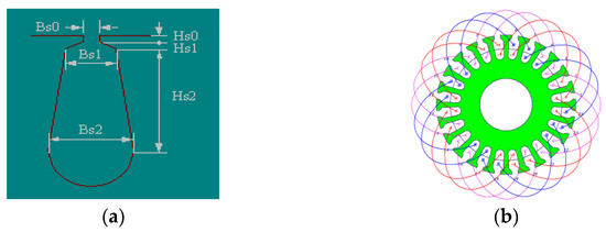 There are four different slot types available for the user to examine in the Ansys software. Considering the maximum efficiency, the slot type shown in Figure 4a was selected for the motor. In this slot type, iron losses are due less to the slot edge height and geometric structure. A two-layer concentrated winding is preferred for the winding selection to achieve favorable operation parameters [6]. The two-layer winding connections are shown in Figure 4b.