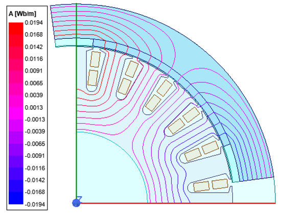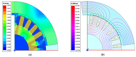 A 2D analysis was performed according to the RMxprt result obtained by the genetic algorithm. In Figure 15a, the stator teeth flux density is 1.5 Tesla, the stator yoke flux density is 1.4 Tesla, the rotor yoke flux density is 1.2 Tesla, and the air gap flux density is 0.65 Tesla. The flux density values are all within the limits. In Figure 15b, it was observed that the flux distribution was uniform.