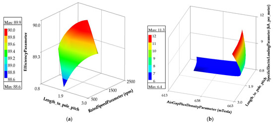 In this section, the effect of the change in the motor L/τ was examined for the motor parameters. The Dsi/Dso was taken as a constant (0.45). Initially, when this ratio was 1, the Dso was 90, and the L was 71 mm. The Dro, δ, air gap average flux density, ac, hm, number of poles, number of stator slots, number of conductors per slot, and conductor diameter were kept constant. The Dsi and magnet width (mm) were updated at each step according to the L/τ. The magnet width was also changed from 58 mm to 33.43 mm. Thus, the pole arc/pole pitch ratio was fixed at each step. In the second step, when the motor L/τ was 1.5, the Dso was 80 mm, and the L was 93 mm. Similarly, when the L/τ was 2, the Dso was 72 mm, and the L was 113 mm. Finally, when the L/τ was 3, the Dso was 63 mm, and the L was 147 mm. According to the simulation results obtained, the efficiency vs. speed curve is given in Figure 8a. The specific electric loading-ac vs. the airgap flux density curve is given in Figure 8b.