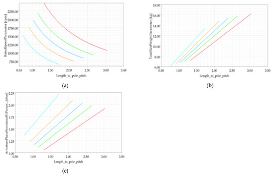 In Figure 9, the effect of the ratio of the motor on some parameters is shown and represented by the rated speed vs. length to pole pitch, the total net weight vs. length to pole pitch, and the armature phase resistance vs. length to pole pitch a, b and c curves, respectively. The motor axial length value range is 65–150 mm, and the stator outer diameter value range is 63–110 mm. The number of magnet poles is fixed (p = 4). The parametric analysis was performed according to these value ranges. As the L/τ increased, the armature phase resistance increased, because when the axial length of the motor increased, the conductor length also increased. The total net weight increased from 6 to 16 kg due to the increase in axial length. The rated torque was also around 3 Nm at the beginning but exceeded 4 Nm in the final state. A very significant decrease in the rated speed was observed. The reference rate was observed dropping from 1500 to 1000 rpm.