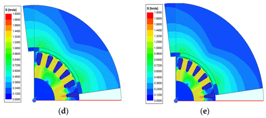 In Figure 10a, the average flux density in the rotor yoke is 1.65 Tesla. The average flux density of the stator yoke is 1.30 Tesla. The stator tooth flux density is 1.40 Tesla, and the air gap flux density is 0.61 Tesla. In cases b–e, the stator yoke flux density, air gap flux density, and stator tooth flux density are approximate values. The rotor yoke flux density is 0.34 Tesla in the last case. Considering the magnetic circuit of the motor, the flux formed in the magnet passes through the stator and rotor yokes and completes its circuit. As the rotor yoke height increases, the length of the flux path increases. In this case, a lower flux density occurs because the flux path in the rotor is long.