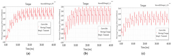 Torque ripple in electrical machines is caused by factors including cogging torque, mechanical motion, air gap harmonics, and magnetomotor force [26,27]. The torque ripple is defined as the percentage of the difference between the maximum torque Tmax and the minimum torque Tmin compared to the average torque Tavg.