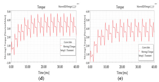 In Figure 11a, a torque ripple of 1 Nm occurs every 2 ms. The maximum torque is ob-served at 5.9 Nm. The torque ripple is at 137.37%. In Figure 11b, a torque ripple of 1 Nm occurs every 1.50 ms. The maximum torque is observed at 3.47 Nm. The torque ripple is at 152.47%. In Figure 11c, a torque ripple of 1.30 Nm occurs every 1.50 ms. The maximum torque is observed at 4.43 Nm. The torque ripple is at 166.63%. In Figure 11d, a torque ripple of 1.40 Nm occurs every 1.90 ms. The maximum torque is observed at 4.69 Nm. The torque ripple is at 161.71%. In Figure 11e, a torque ripple of 1.30 Nm occurs every 2 ms. The maximum torque is observed at 5.08 Nm. The torque ripple is at 150.49%.