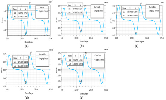In Figure 12a, the cogging torque is 0.7933 Nm. In Figure 12b, the cogging torque is 0.8292 Nm. In Figure 12c, the cogging torque is 0.9892 Nm. In Figure 12d, the cogging torque is 11028 Nm. In Figure 12e, the cogging torque is 1.2734 Nm.