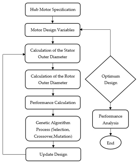 The stator outer diameter and axial length were optimized by the genetic algorithm process according to the flowchart shown in Figure 13. The genetic algorithm process was carried out with the help of the optimization tool in Ansys Electronics Desktop software. The lower and upper limit values for the stator outer diameter and axial length were determined. While determining these limit values, the initial physical dimensions of the motor were taken as the reference. In the genetic algorithm optimization tool, the population size was chosen to be 50, the selection method was chosen to be the roulette wheel, two-point crossover, and the mutation probability was chosen to be 0.05. The stator outer diameter and axial length values that provided the maximum efficiency were obtained.
