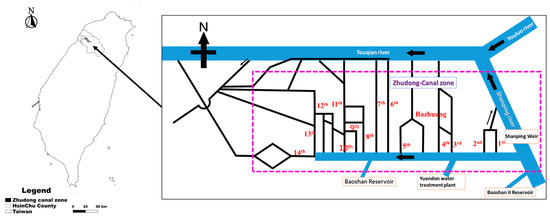 The study area of the Zhudong irrigation zone is located within the Touqian River watershed in Northern Taiwan, and its total irrigation area is approximately 800 ha, in which rice is the main crop during the growing season, i.e., the middle of February and the end of November (the fifth to thirty-third 10-day periods). The Zhudong irrigation zone comprises 15 irrigation canals, the irrigation extent of which can be seen in Figure 2a; two reservoirs (Baoshan and Baoshan II) as well as a water treatment plant (Yuandon) (see Figure 1). Note that the irrigation management of the 15 canals is carried out by supplying the irrigation water from upstream to downstream in accordance with the corresponding water demands.