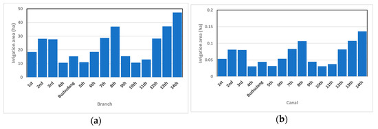 Irrigation area and corresponding weights of the 15 canals in the Zhudong irrigation zone. (a) Irrigation extent; (b) Weights of estimated canal-based planned irrigation water demands.