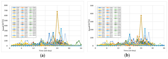 Annual time series of observed 10-day runoff in the (a) Shanping and (b) Youluo Rivers in 1959–2017.