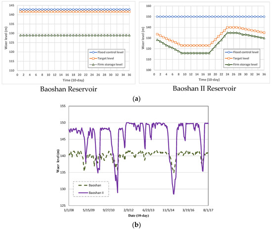 Operating rules and annual initial water level of the Baoshan and Baoshan II Reservoirs. (a) Reservoir operating rules; (b) Annual initial water levels.
