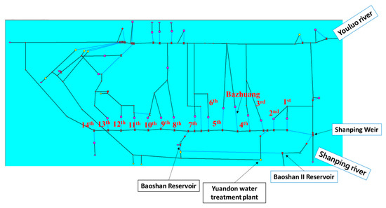 According to the irrigation canal network of the Zhudong irrigation zone introduced above, the corresponding water allocation (RIBASIM) model could be configured as shown in Figure 6. Within the RIBASIM model configured for the Zhudong irrigation zone, the 10-day surface runoff from the Shanping Weir is regularly allocated based on the intake ranking of the canals and hydraulic structures from upstream to downstream. Moreover, in this study, determining the irrigation water allocation using the RIBAISM model, the inflow from the rainfall and outside hydrological structures and specific outflow, i.e., hydrological loss (e.g., the evapotranspiration and infiltration) are not considered; the unique operations of the irrigation water supply during the drought periods are also excluded in the RIBAIM. In summary, the RIBAIM model adopted in the development of the proposed RA_IWS_Canal model focuses on simulating the irrigation water supplies at the canals, corresponding to various conditions of the inflow from the rivers and water intakes at the other canals and hydraulic structures within the multi-canal irrigation zone.