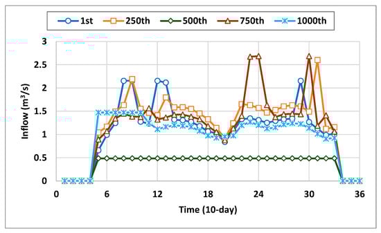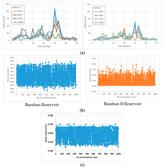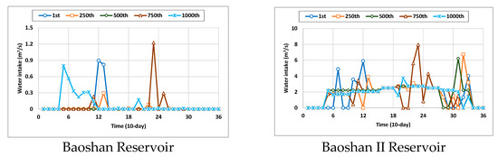 After generating the 1000 uncertainty factors, the estimations of the 10-day inflow at the center of the Zhudong irrigation zone through the Shanping Weir carried by the Shanping and Youluo Rivers, based on the associated simulations of the maximum water intake (see Figure 10), the resulting water supplies of 15 irrigation canals from the RIBASIM model can be then accomplished. Figure 11 and Figure 12 illustrate the simulations of the inflow at the Shanping Weir and resulting simulated water supplies at the 2nd, 4th, 8th, and 14th canals for the 1st, 250th, 500th, 750th, and 1000th simulation cases, respectively. It was shown that when the high inflow of over 1.5 m3/s at the Shanping Weir was provided, the irrigation canals carried irrigation water. For example, in the 500th simulation case, with the inflow of 0.5 m3/s, only the first canal can obtain the irrigation water of about 0.025 m3/s; most of the inflow may be carried by the Baoshan Reservoir and Yuandon water treatment plant. Accordingly, the simulations of the corresponding water intakes of the Baoshan and Baoshan II Reservoirs are then obtained (see Figure 13) in response to the impact on the irrigation water allocation in the Zhudong irrigation zone. As a result, the above reservoirs’ water intake, instead of the annual initial water levels in the reservoirs, are defined as the hydrological factor.