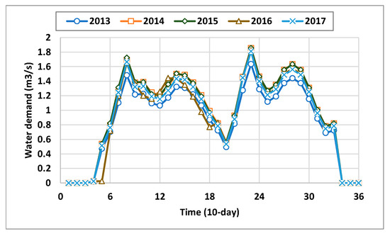 Historical 10-day planned irrigation water demands in the Zhudong irrigation zone.