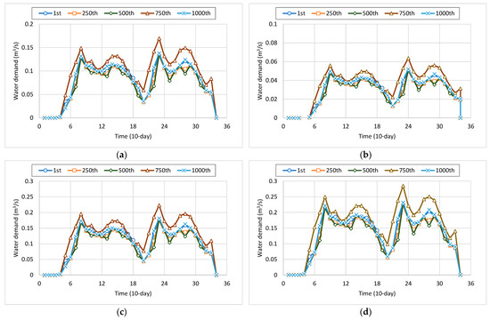 Figure 9 illustrates the 1st, 250th, 500th, 750th, and 1000th simulation cases of the planned irrigation water demands at the 2nd, 4th, 8th, and 14th irrigation canals.