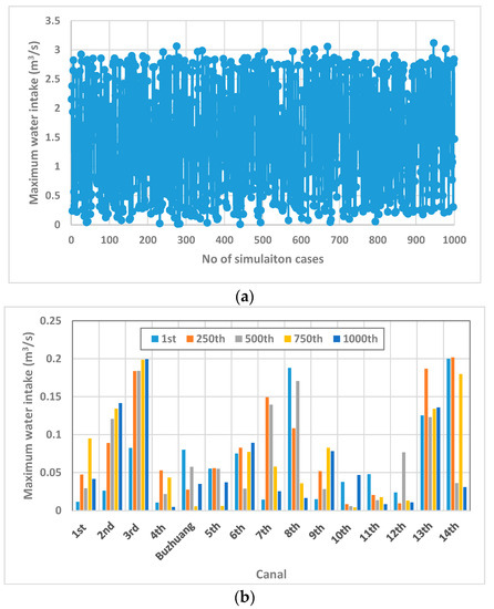 Simulations of the irrigation factors used in the estimations of the irrigation water supply. (a) Maximum water intake at the Shanping Weir; (b) Maximum water intakes of the gates at 15 canals for the 1st, 250th, 500th, and 1000th simulation cases.