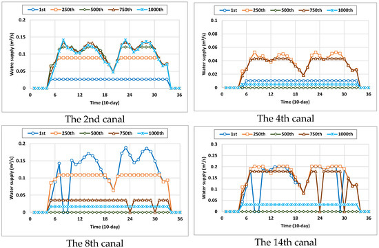 1000 simulations of the 10-day irrigation water supply at the 2nd, 4th, 8th, and 14th canals.