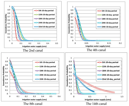 In reference to Figure 14, the exceedance probability declines with the irrigation water demand, and usually approaches zero in cases where the water demand is over 0.3 m3/s. This shows the exceedance probabilities of the irrigation water supplies of 0–0.6 m3/s at the 2nd canal from the 5th to 33rd 10-day periods, indicating that the exceedance probability curves have different varying trends with the 10-day periods. Specifically, the exceedance probabilities at the 3rd and 8th canals sharply decline with the irrigation water supply, with a higher variation compared to the remaining canals, due to the water intake of the Baoshan Reservoir and the Yuando water treatment plant.