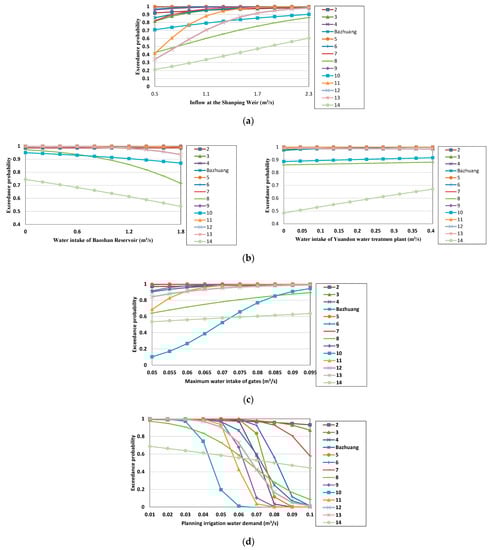 Exceedance probabilities of the irrigation water supply considering the variation in the uncertainty factors. (a) Inflow of the Shanping Weir; (b) Water intake of hydraulic structures; (c) Maximum water intake of the canal-based gate; (d) Planned irrigation water demand.