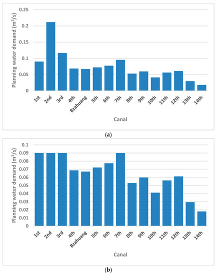 In addition, the proposed RA_IWS_Canal model can be employed to formulate the planned irrigation water demands under acceptable reliability via Equation (12). Figure 16 represents the planned water demands at 15 irrigation canals as a result of the specific hydrological and irrigation factors (see Table 6) under a reliability of 0.7, in which the planned water demand at the first canal is assigned as the gated-based maximum water intake (i.e., 0.09 m3/s), without the corresponding exceedance probability calculation equation. This can be seen in Figure 16a. Despite a high reliability of 0.7, the original estimated water demands at the first, second, third, and seventh canals exceed the maximum delivered water of 0.09 m3/s to the total irrigation water demand added into the water intakes of the Baoshan Reservoir (1.1 m3/s) and Yuando water treatment plant (0.3 m3/s), greater than the inflow at the Shanping Weir of 2.4 m3/s. Thus, when the irrigation water demands at the above canals are assigned as the maximum delivered water of 0.09 m3/s, as shown in Figure 16b, the water demands at the remaining canals can then be estimated. The corresponding total water carried, including the canal-based water demands and water intakes of the Baoshan Reservoir and Yuandon water treatment plant, is approximately 2.4 m3/s. The proposed RA_IWS_canal model could be applied to formulate the planned irrigation water demands by the probabilistic decision-making algorithm with the desired reliability.